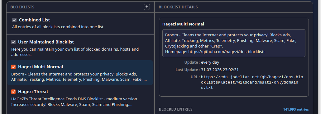 Blocklists let you cut off whole categories of unwanted traffic at once. Little Snitch downloads them from remote sources and keeps them current automatically. It accepts lists in several common formats: one domain per line, one hostname per line, /etc/hosts style (IP address followed by hostname), and CIDR network ranges. Wildcard formats, regex or glob patterns, and URL-based formats are not supported. When you have a choice, prefer domain-based lists over host-based ones, they're handled more efficiently. Well known brands are Hagezi, Peter Lowe, Steven Black and oisd.nl, just to give you a starting point.