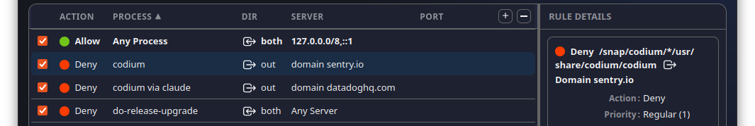 Blocklists work at the domain level, but rules let you go further. A rule can target a specific process, match particular ports or protocols, and be as broad or narrow as you need. The rules view lets you sort and filter them so you can stay on top of things as the list grows.